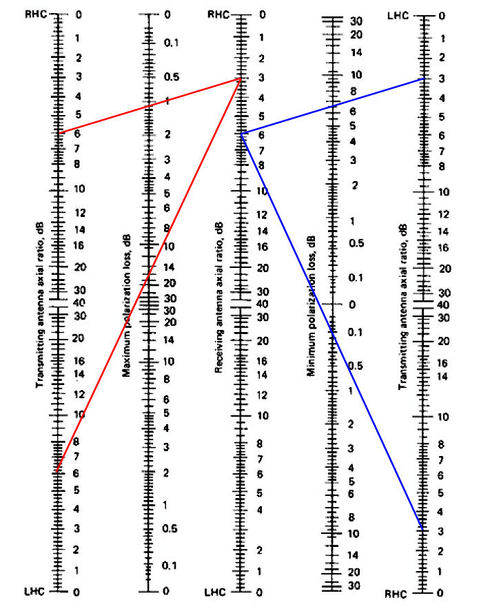 The nomogram below is quite useful for estimating loss due to ellipticity when the axial ratios are known. If one has an axial ratio of 3dB and the other has an axial ratio of 6dB, the maximum loss due to polarization between those two stations will be around 1.1dB. The minimum loss will be around 0.1dB. On the other hand if one station was using LHCP and the other was using RHCP, the minimum loss between then would be 7dB and the maximum loss would be around 16dB.